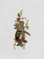 The Cupid's Promise lapel pin. The serene scene is a vintage cupid overlooking someone who is ready for love. He's sitting atop a cluster of baby rose blossom and turquoise stones. It is accented by Swarovski crystal blossoms and leaves. All finished with 14kt gold-filled wire. Works beautifully with a variety of colors due to the neutral color palette.