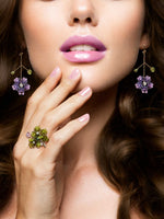 This floral twist in this two-toned lilac is gorgeous and is perfect with navy, apple greens, various grays, and more. It is handcrafted with Swarovski crystals along with two peridot, semi-precious stones right in Maryland.