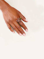 The double bloom ring is absolutely stunning in Vintage Pink and the most feminine hint of pink and packs a ton of sparkle. The color is the faintest of pink and works beautifully with nude monochromatic looks and packs a lot of sparkle and a hint of color.