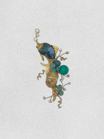 A vintage blue fish is chasing after the pearl bubbles in the deep blue, following the fish is a cluster of natural aquamarine, turquoise stones and champagne crystal drop. Floating rhinestones fill the scene.