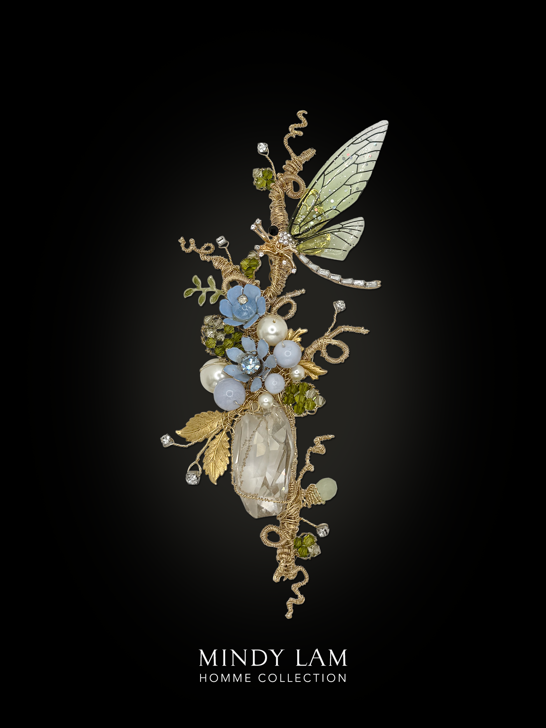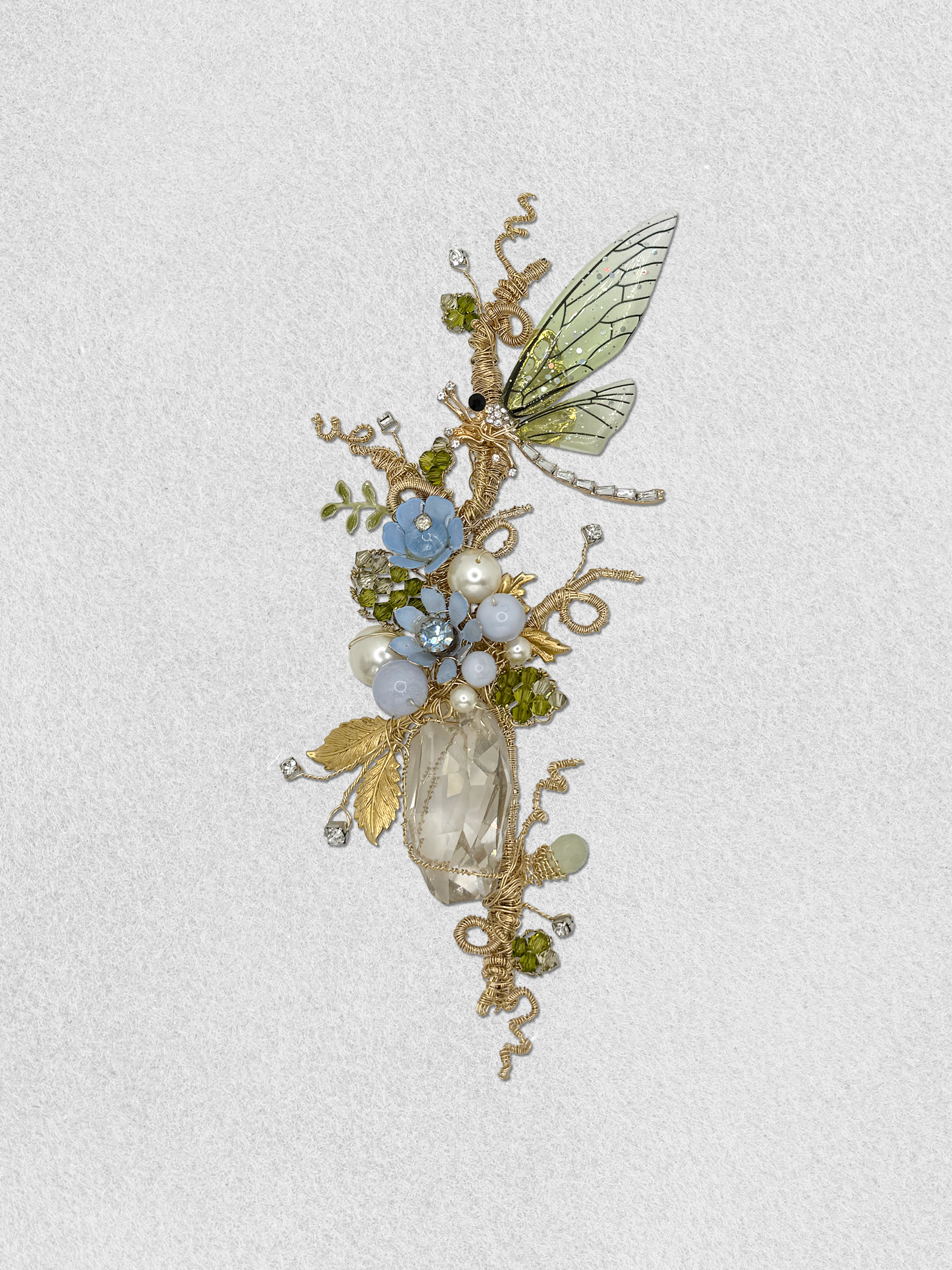 A jeweled dragonfly is overjoyed by the sight of the blue vintage garden. The scene is filled with pearls, vintage elements, floating rhinestones, crystal leaves, vintage foliage, natural green garnet and a clear crystal drop.