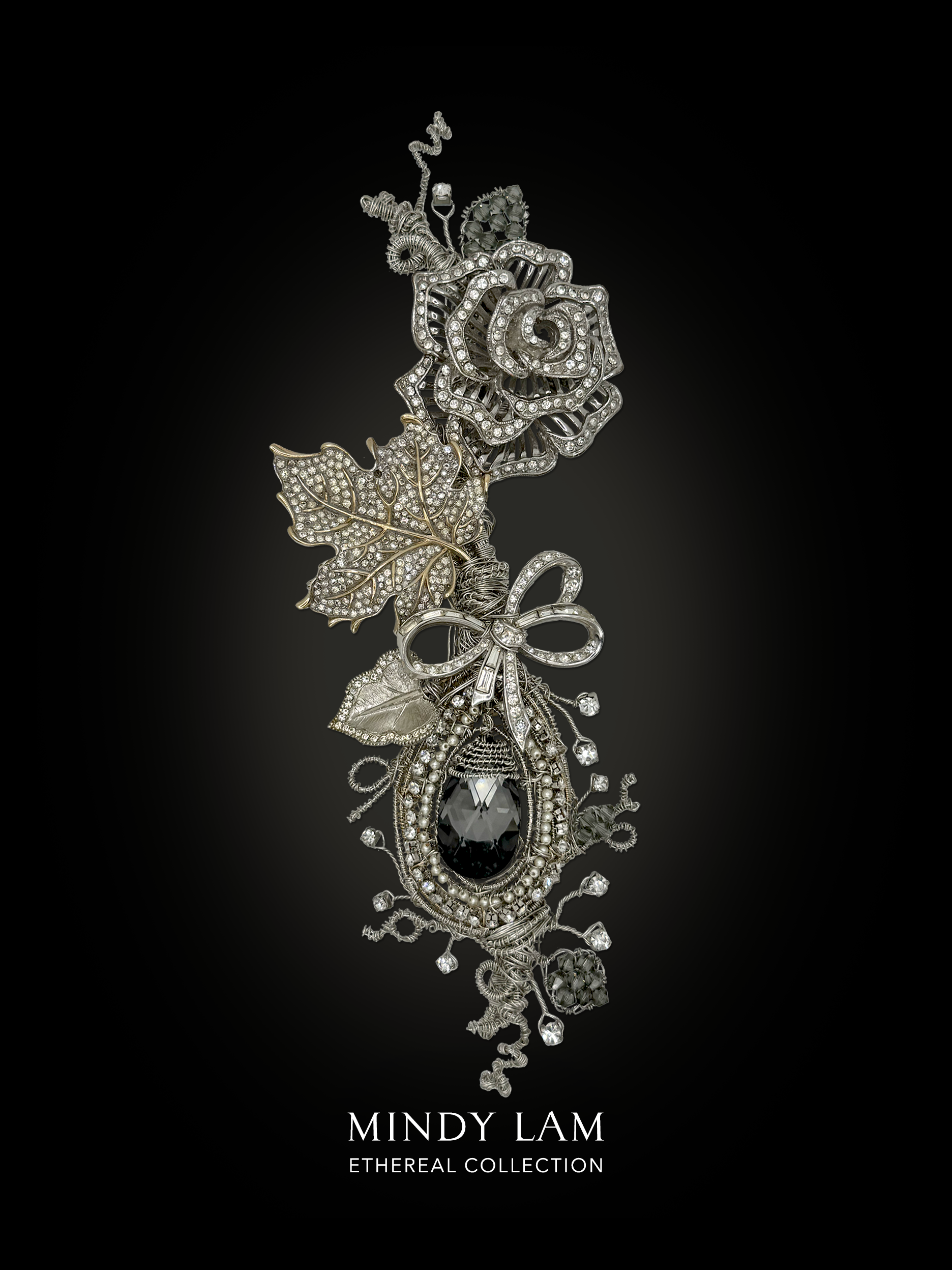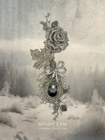 The jeweled silver rose is surrounded and loved by vintage foliage, the pairing is tied together by a jeweled vintage bow. The scene is accented with crystal leaves, floating rhinestones and rooted in a black shadow crystal drop framed by rings of silver vines, rhinestones and pearls.
