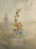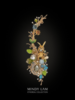 The vintage bunny with the best smile has charming red eyes. Her garden is filled with array of vintage flower blossom, glass and crystal leaves and a collective of nature gems. You can find natural agate, aquamarine, citrine, golden rutilated quartz and turquoise throughout the lapel pin. The lapel pin is accompanied by pearls and floating rhinestones. The brooch is rooted in a 18ct green amethyst drop framed by pearls, rhinestones and gold vines. All finished with 14kt gold-filled wires.