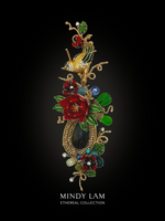 Our vintage goldfinch is perched by the vintage crimson red zinnia and crystal flowers. The garden is filled with natural agates, aquamarine, green garnets and turquoise stones. The scene is rooted in a stunning azurite malachite stone framed by gold vines and pearls. The lapel pin is accented by crystal leaves, floating rhinestones and finished with 14kt gold-filled wires.