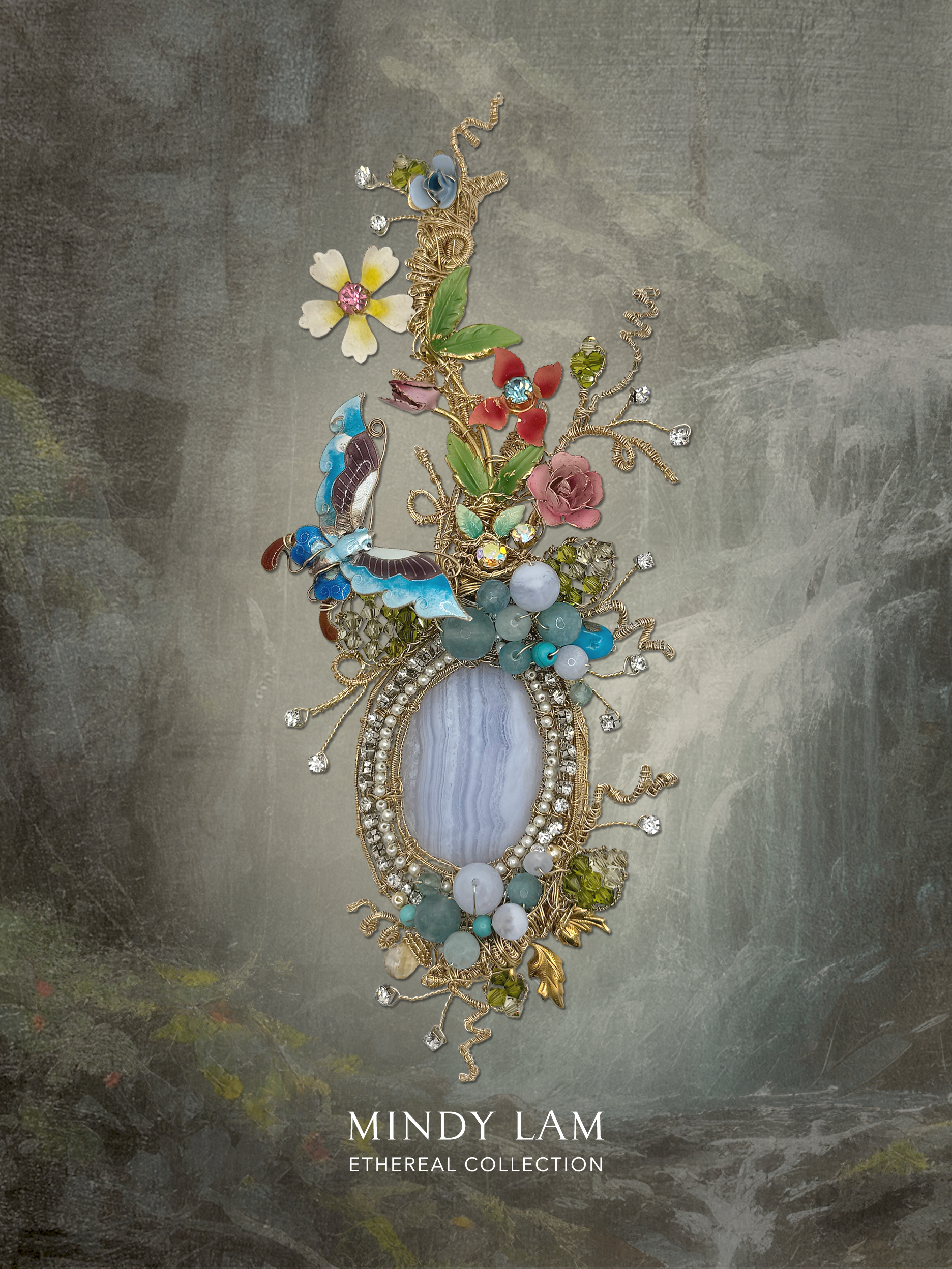 The vintage butterfly is hovering by a blue lace agate framed by rhinestone, pearls and gold vines. The scene is filled with crystal leaves, vintages floral elements, vintage foliage, natural aquamarine, blue lace agate and turquoise stones. All finished with 14kt gold-filled wires.