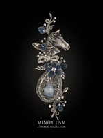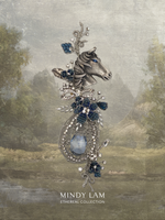 The vintage horse possesses mesmerizing blue jeweled eyes, adorned with a ribbon. It is engulfed in silver vines and surrounded by floating rhinestones that mimic the shimmer bouncing off its coat. The horse is further accented with Mindy Lam Classic denim blossoms. A crisp blue crystal drop is framed by silver vines and rhinestones, all elegantly finished with 14kt gold-filled wires.