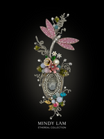 The jeweled dragonfly is surrounded and loved by vintage blossoms. The scene is accented with crystal leaves, floating rhinestones, pearls, aquamarine, blue lace agate and turquoise stones. Rooted in a sky blue crystal drop framed by rings of silver vines, rhinestones and pearls.