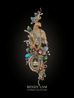 The golden eagle is a vintage by Ciner with mosaic matte feathers. His talons grips onto the gold branch filled with Mindy Lam Classic mocha crystal flowers. The lapel pin is accented with crystal leaflets, floating rhinestones, natural aquamarine and turquoise stones. The lapel pin is rooted in a 33ct green amethyst stone framed by a ring of rhinestones and pearls. All finished with 14kt gold-filled wires.