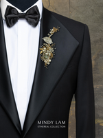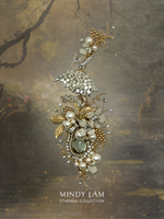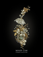 The vintage fairy dances on top of a 27ct green amethyst stone, its sparkle and reflection mimicking the shimmering pond under the moonlight. The green amethyst is engulfed in gold vines and adorned with rhinestones and pearls. Mindy Lam Classic pearl blossoms thrive alongside vintage foliage. Accented by floating rhinestones representing the sparks from fireflies complementing the fairy's movements. The lapel pin is finished with 14kt gold-filled wires.