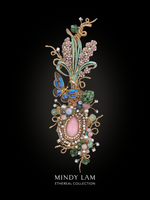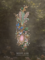 Our vintage sage is rooted in a stunning 22ct pink opal framed by rings of rhinestones and pearls. A vintage indigo butterfly is fluttering by the arranged natural aquamarine, blue apatite, green garnet, moonstone, peridot stones. The lapel pin is accented by floating rhinestones, pearls and crystal leaves. All finished with 14kt gold-filled wires.