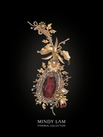 The vintage jeweled centered orchid gracefully stretch its petals. Accented by vintage floral elements, foliage, pearls and floating rhinestones. The delicate orchid is rooted in gold vines and anchored by a crimson red crystal drop framed by pearls and rhinestones. The scene is tranquil and opulent. All finished with 14k gold-filled wire.