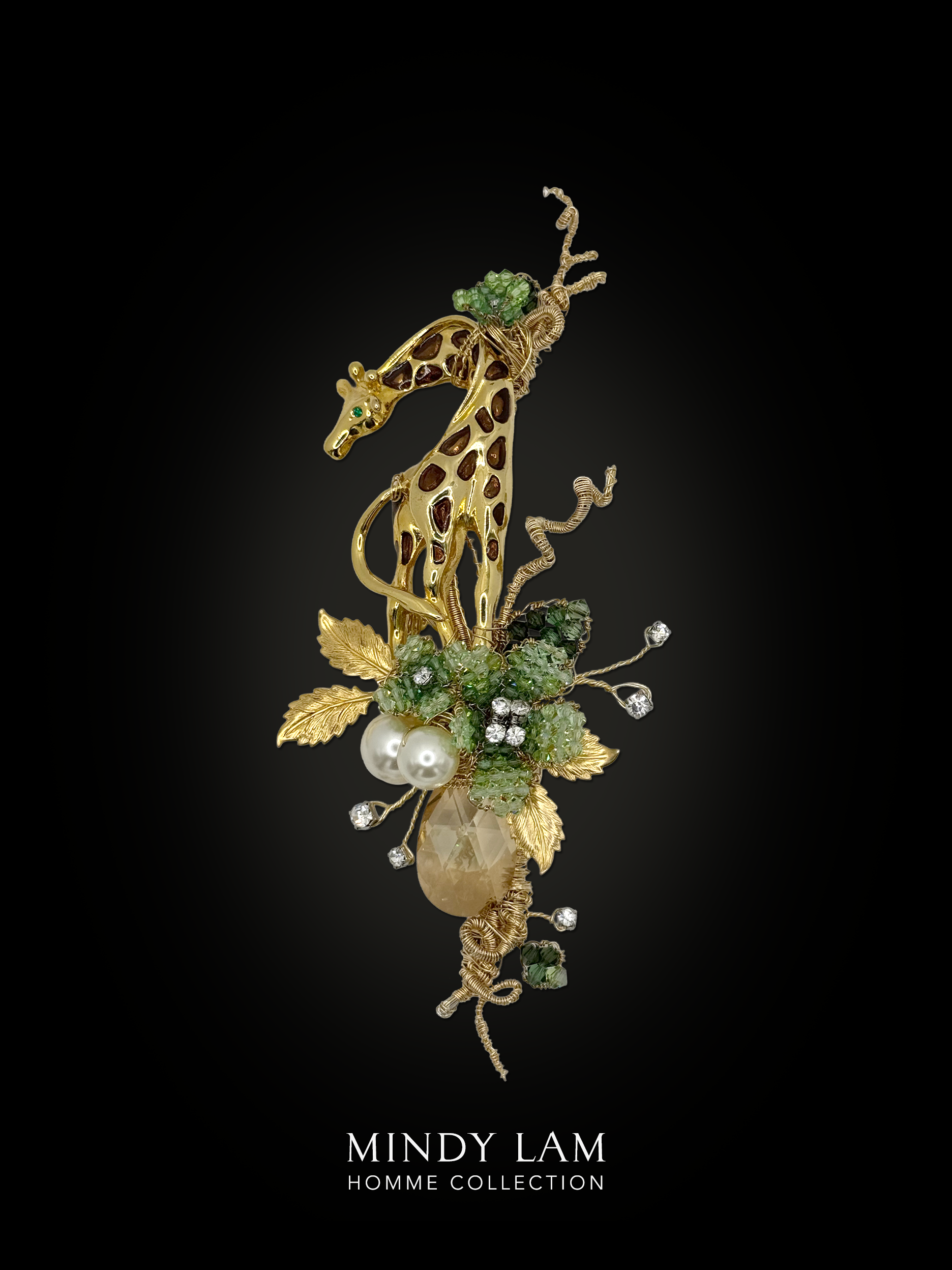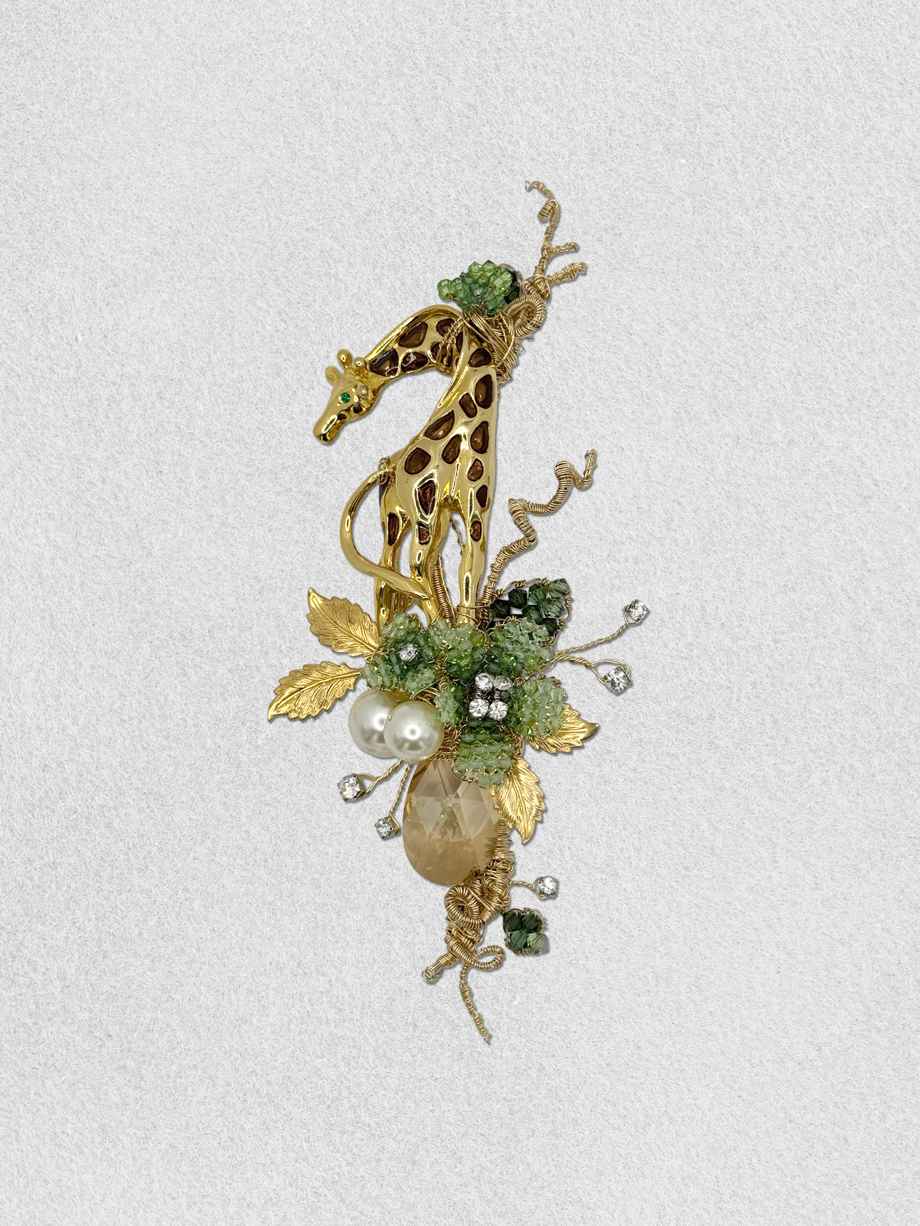 A gold vintage giraffe is gazes back toward the sunset, standing beside a pair of mint crystal blossoms, crystal leaves, vintage foliage. Adorned with pearls, floating rhinestones, and a champagne crystal drop.