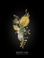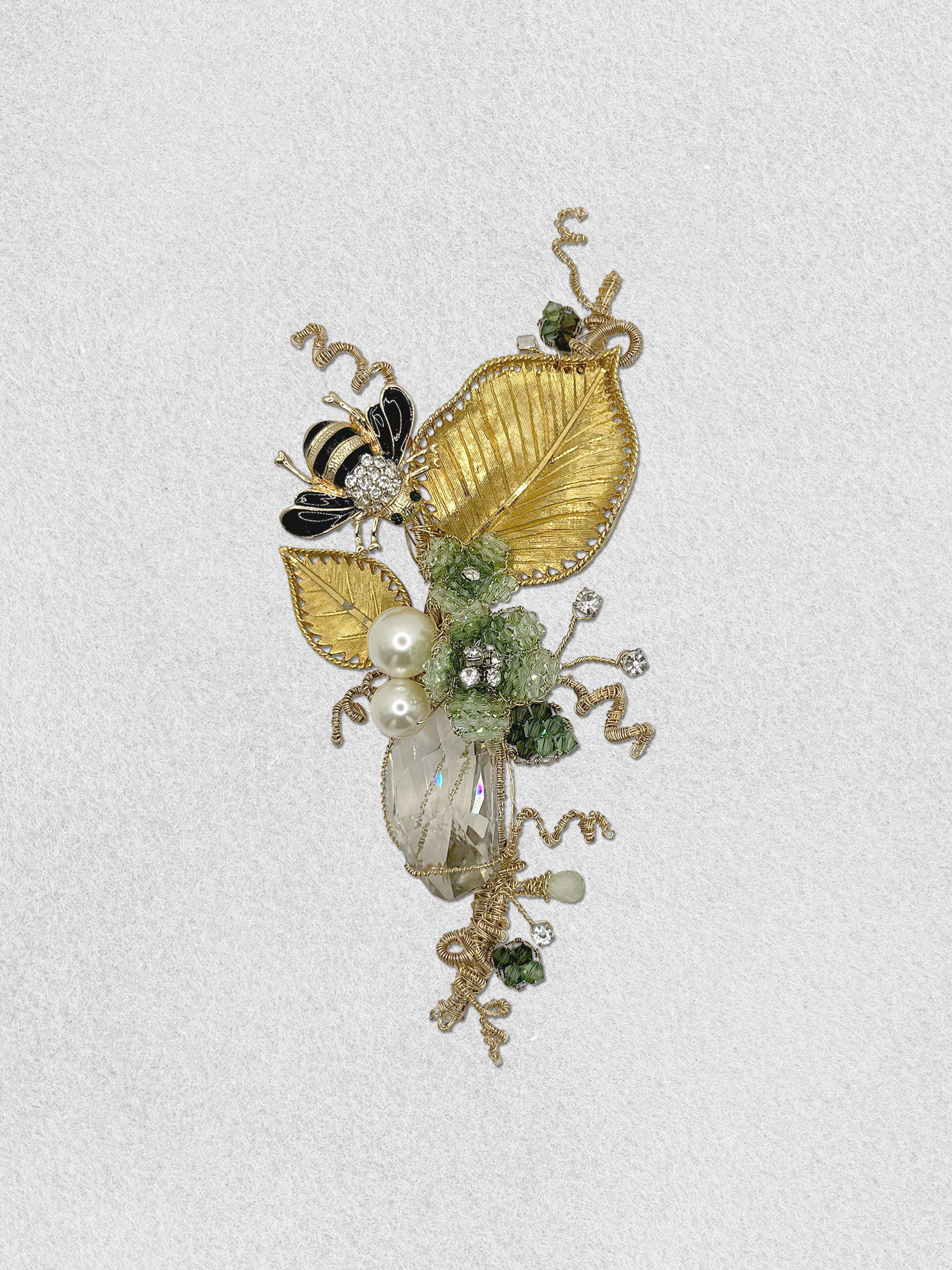 A jeweled bumble joins the gold vintage foliage in a dance. The scene is filled with floating rhinestones, crystal flowers, crystal leaves, pearls, a natural green garnet stone and a clear crystal drop.