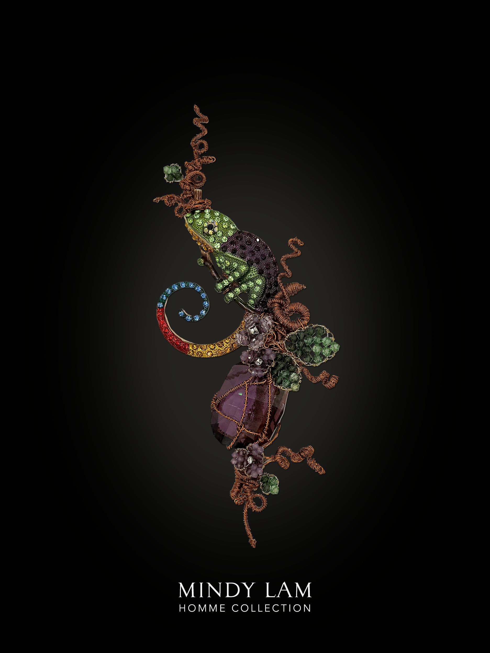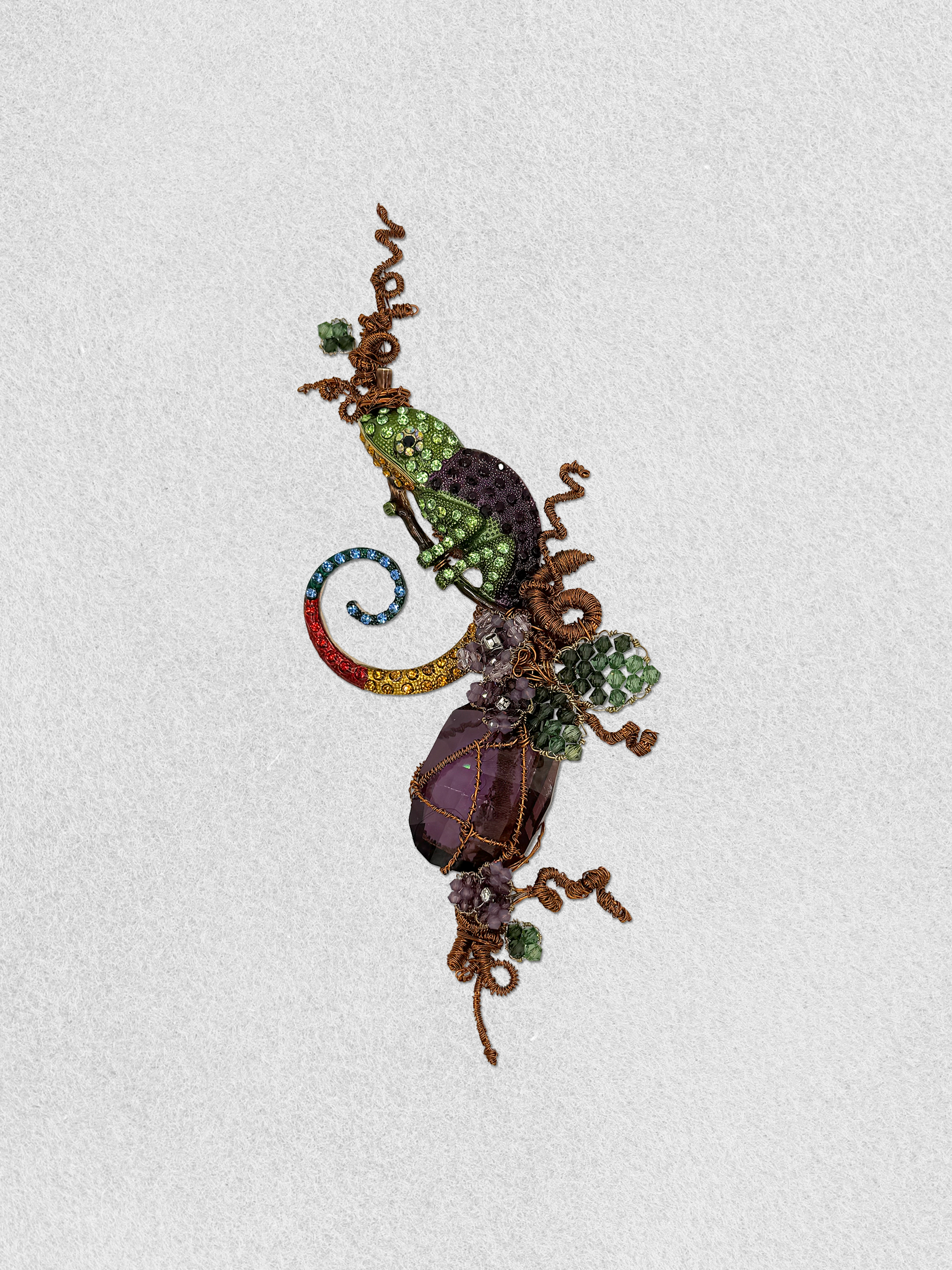 The Charm of the Rainforest lapel pin. The charm of this adorable chameleon is captivating all who lay eyes upon it. Camouflaged by a cluster of lilac crystal blooms, forest green crystal leave and anchored by a plum crystal drop. All finished with 14k gold-filled wire.