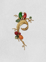 The Christmas Love Story lapel pin. In this sweet scene, we see a pair of vintage emerald and crimson red lovebirds adoring one another, meeting for the first time at a Christmas party. They are perched atop a golden leaf resembling a feather. They are accented by crystal leaves, crystal drops and natural coral stones. All finished with 14k gold-filled wire.