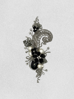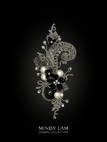 The Dance of the Silver Feather lapel pin. In this scene, a silver vintage leaf dances with a a cluster of black crystal blossoms. They move elegantly together. The scene is filled with floating rhinestones, crystal leaves, pearls and anchored by a black crystal drop framed by a ring of silver vines.