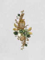 The Jeweled Eyes of the Forest lapel pin. A vintage gold owl with sweet green eyes is sitting above a cluster mint green crystal blossoms. Anchored by a champagne crystal drop, accented by floating rhinestones, pearls, crystal leaves and vintage foliage. All finished with 14k gold-filled wire.