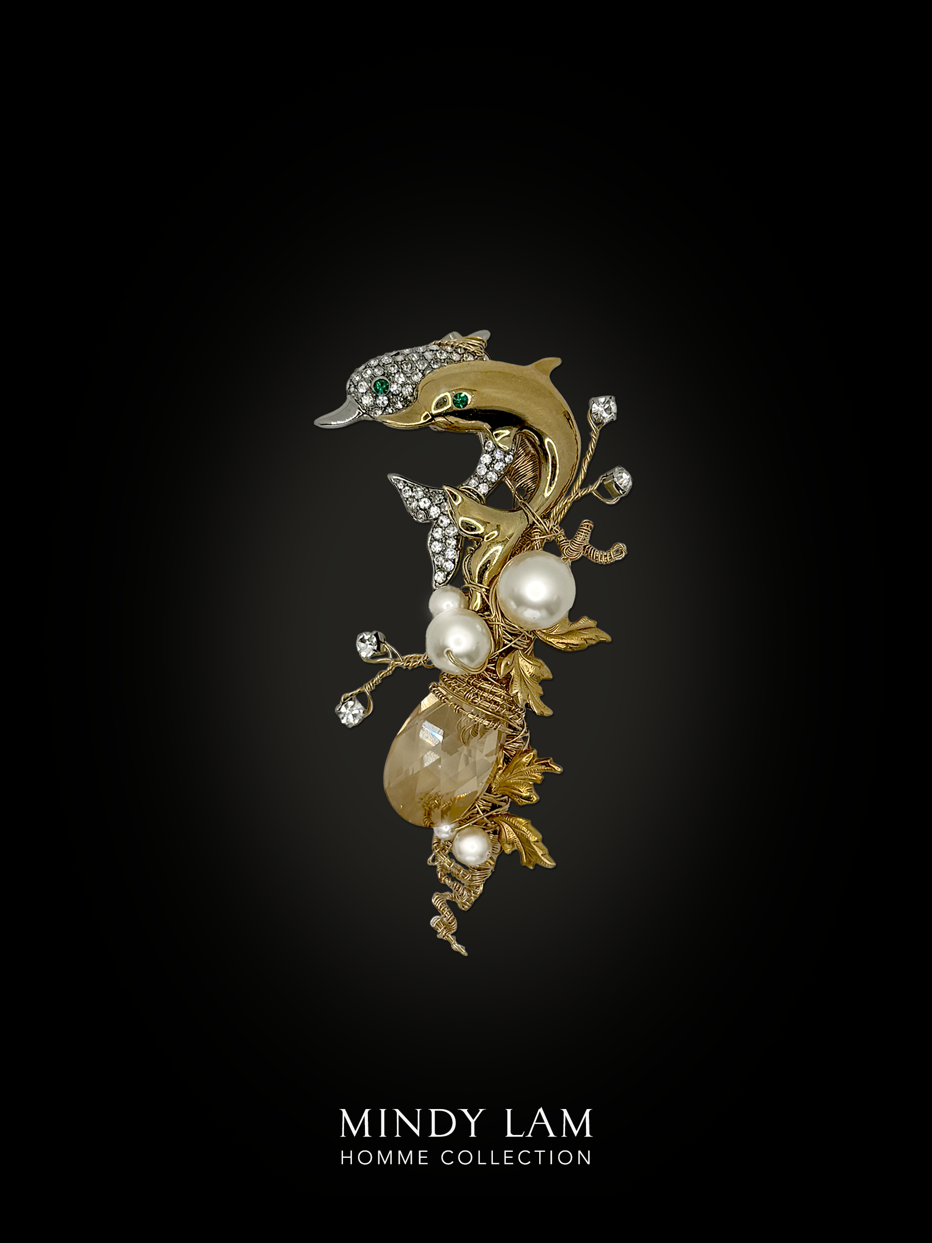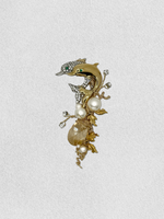 The Leap in Pair lapel pin. In this scene we follow the journey of a pair of vintage dolphins, they leap out of the water. Swimming with rhythm between pearls. The scene is filled with vintage foliage, floating rhinestones and anchored by a champagne crystal drop. All finished with 14kt gold-filled wire.