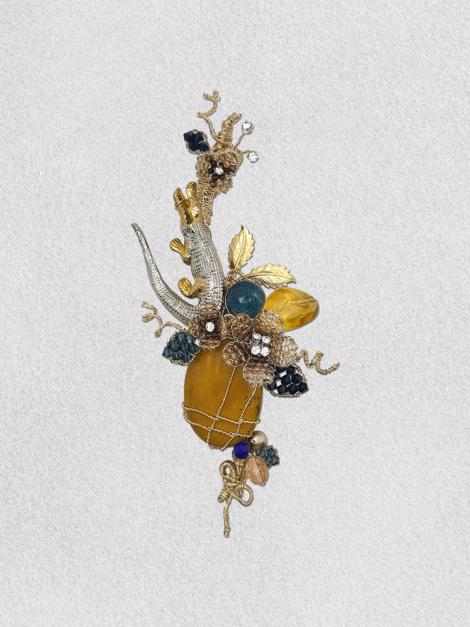 The Legends of the Marsh lapel pin. The scene is a vintage alligator enjoying the marsh by tan crystal blossoms. Accented with vintage foliage, crystal leaves, floating rhinestones, natural blue apatite and anchored by an agate stone. All finished with 14k gold filled wire.