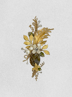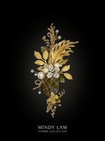 The Pearl Garden and Whimsy lapel pin. The scene is a pearl blossom garden, the garden is filled with vintage foliage, a gold butterfly flutters by. The scene is accented with pearls, floating rhinestones and anchored by an agate stone. All finished with 14k gold-filled wire.