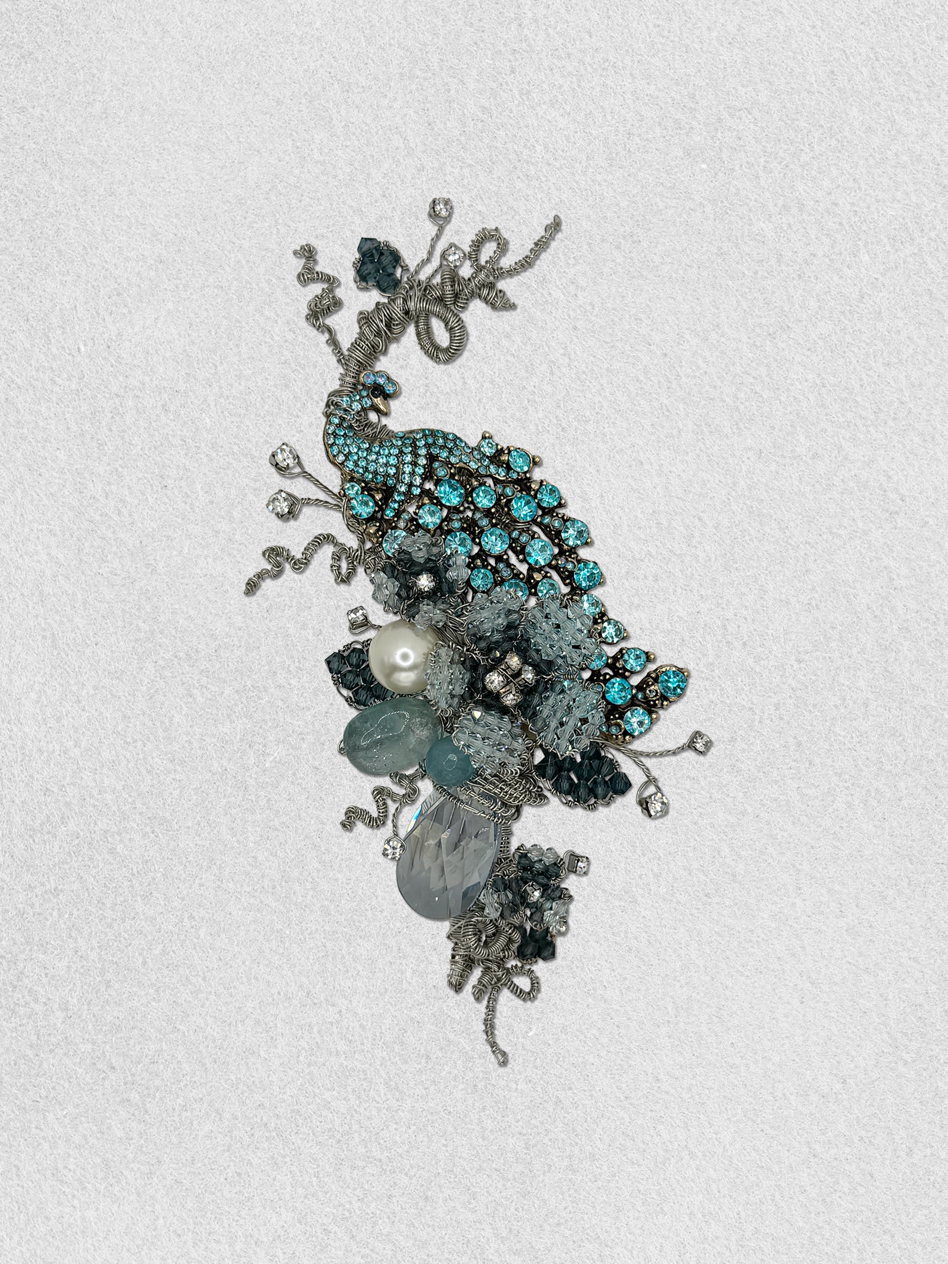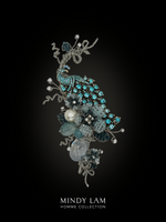 A jeweled peacock is inspired by the crystal blossoms in the moonlit garden. The scene is filled with pearls, floating rhinestones, crystal leaves, natural aquamarine and a crystal drop.
