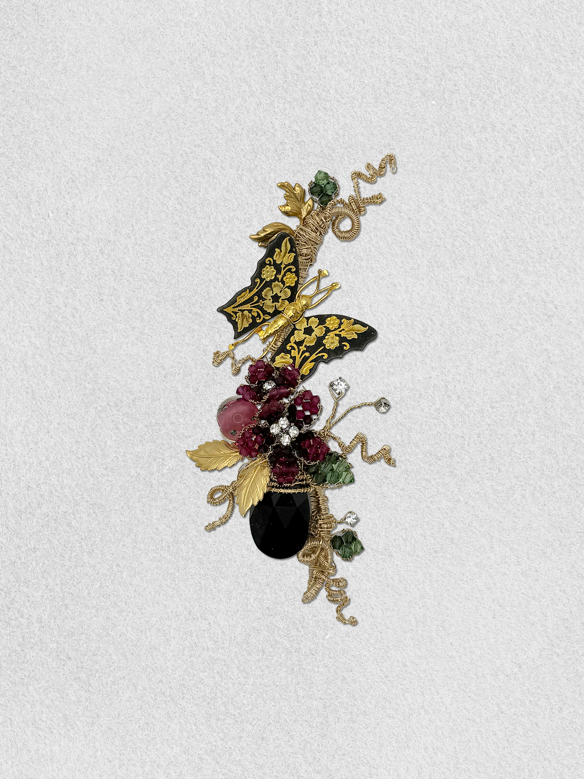 A vintage butterfly is hovering by the fresh bloomed fuchsia crystal flowers in the garden. The scene is filled with crystal flowers, floating rhinestones, crystal leaves, vintage foliage and a black crystal drop.