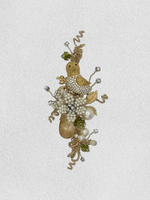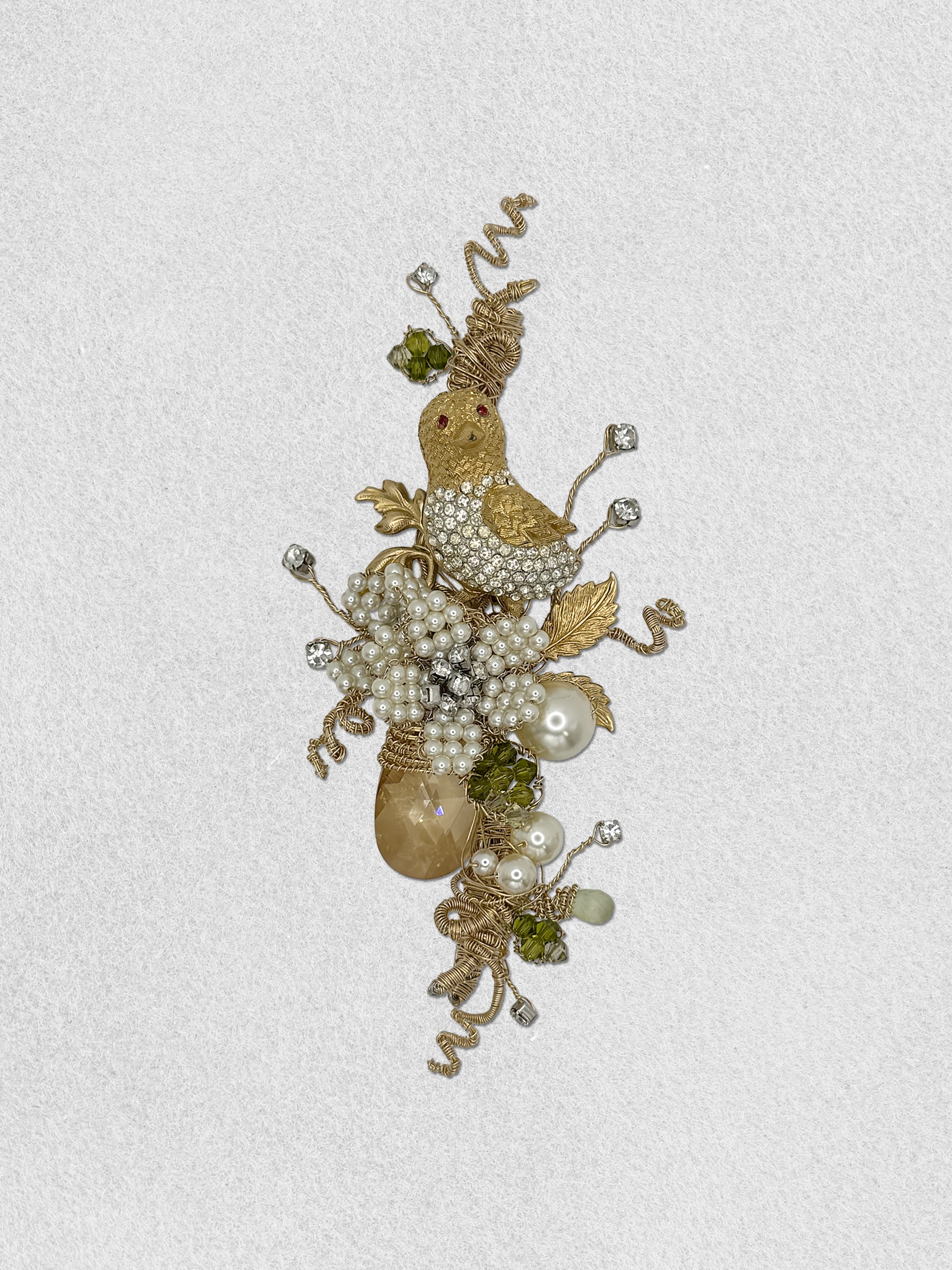 A jeweled vintage mourning dove is resting by pearl blossoms on the tree branch. The scene is filled with pearl flowers, pearls, floating rhinestones, crystal leaves, vintage foliage, natural green garnet and a champagne crystal drop framed by rings of gold vines.